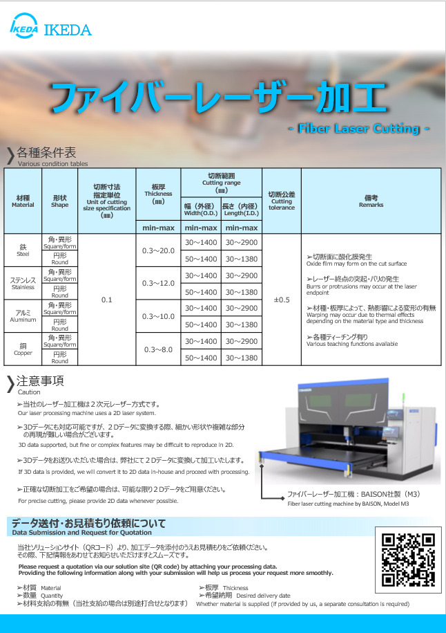 当社が導入したファイバーレーザー加工機「M3 Laser Cutter」は、最大出力6kWの高出力レーザーを搭載した高性能な設備です。鉄は最大22mm、ステンレスは12mm、アルミは10mmまでの板厚に対応し、薄板から中厚板まで幅広い加工が可能です。また、対応可能な材料サイズは最大3,000mm × 1,500mmとなっており、多様なニーズにお応えします。